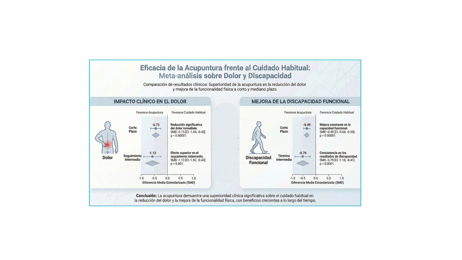 En dolor inmediato postratamiento, el metaanálisis incluyó 7 ensayos clínicos aleatorizados con 1.048 participantes y encontró un efecto estadísticamente significativo a favor de la acupuntura: SMD = -0,73 (IC 95%: -1,04 a -0,42; p < 0,00001; I² = 68%). Se trata de un efecto de magnitud moderada, aunque con heterogeneidad moderada-alta. Los análisis de sensibilidad mantuvieron la dirección del efecto y, al excluir estudios atípicos, la heterogeneidad descendió a 0%. En discapacidad inmediata postratamiento, el efecto combinado fue moderado y estadísticamente significativo a favor de la acupuntura: SMD = -0,49 (IC 95%: -0,68 a -0,30; p < 0,00001; I² = 20%). En dolor a medio plazo, el efecto fue grande y estadísticamente significativo: SMD = -1,13 (IC 95%: -1,82 a -0,43; p = 0,001), aunque con una heterogeneidad muy alta (I² = 89%). En discapacidad a medio plazo, el efecto también favoreció a la acupuntura con una magnitud moderada-alta: SMD = 0,79 (IC 95%: -1,18 a -0,41; p < 0,0001; I² = 68%). Además, los análisis de sensibilidad mantuvieron en general la dirección de los resultados. Cuando se restringieron a ensayos con electroacupuntura, o cuando se excluyeron algunos outliers, el beneficio se conservó. Los tamaños del efecto observados no son pequeños. En términos generales, sugieren que la acupuntura no solo obtiene significación estadística, sino que podría producir una mejoría perceptible y útil para muchos pacientes con lumbalgia crónica, tanto en dolor como en discapacidad. Los propios autores hablan de reducciones clínicamente significativas o clínicamente relevantes. Sin embargo, el estudio expresa los resultados sobre todo mediante SMD o diferencia de medias estandarizada. Esto permite combinar escalas distintas, pero también hace más difícil traducir el efecto a un umbral clínico universal fácilmente comprensible, como por ejemplo “2 puntos menos en una escala de dolor” o “10 puntos menos en el ODI”. Por tanto, lo más prudente es decir que los resultados son clínicamente prometedores o probablemente clínicamente relevantes, más que afirmarlo de forma absoluta. Los autores evaluaron la certeza de la evidencia con el sistema GRADE, que analiza cinco dominios: riesgo de sesgo, inconsistencia, imprecisión, indirectitud y sesgo de publicación. En este metaanálisis, la certeza fue baja para los resultados inmediatos y muy baja para los resultados a medio plazo. Eso no significa automáticamente que la acupuntura no funcione. Significa que nuestra confianza en el tamaño exacto del efecto es limitada y que estudios futuros podrían modificar esa estimación. Además, conviene contextualizarlo: la baja o muy baja certeza no es un problema exclusivo de la acupuntura. Es algo muy frecuente en muchas áreas de la medicina clínica. En acupuntura, parte de esta penalización suele venir de dificultades metodológicas casi estructurales de los ensayos: problemas de cegamiento, riesgo de sesgo en algunos apartados del diseño, heterogeneidad entre protocolos, tamaños muestrales modestos y posible sesgo de publicación. Dicho de otro modo: una evidencia de baja certeza no equivale a ineficacia. Equivale a que el resultado debe interpretarse con cautela. El estudio tiene fortalezas, pero también limitaciones relevantes que conviene mencionar en una entrada rigurosa. La primera es el sesgo de idioma: los autores incluyeron solo estudios publicados en inglés. Esto puede dejar fuera ensayos potencialmente importantes publicados en otros idiomas. La segunda es el sesgo de indexación o de cobertura de bases de datos. Aunque buscaron en bases importantes como PubMed, CENTRAL, Scopus y PEDro, no incluyeron bases de datos orientales especializadas, algo especialmente relevante en un campo como la acupuntura. Eso podría haber excluido estudios realizados en países asiáticos y limitar la representatividad del conjunto de la evidencia. También hay que señalar la heterogeneidad clínica: no todas las intervenciones de acupuntura fueron iguales, ni tampoco todos los comparadores de cuidados habituales. Se mezclaron modalidades distintas de acupuntura y diferentes formas de atención convencional. Eso se parece bastante a la práctica real, pero complica la interpretación fina del tamaño del efecto. Y, finalmente, algunos análisis presentaron una heterogeneidad estadística considerable, especialmente el dolor a medio plazo. Pese a sus limitaciones, este estudio aporta algo importante: aclara mejor que revisiones previas qué ocurre cuando la acupuntura se compara directamente con cuidados habituales, sin mezclar sham, placebo o intervenciones añadidas. Eso hace que sus conclusiones sean especialmente útiles para la práctica clínica cotidiana. Si la pregunta es si la acupuntura puede aportar más que el tratamiento habitual en pacientes con lumbalgia crónica, este metaanálisis sugiere que sí, probablemente sí, al menos en términos de dolor y discapacidad, y tanto al final del tratamiento como en el seguimiento intermedio. Este metaanálisis muestra que la acupuntura, comparada con los cuidados habituales, se asocia a mejoras estadísticamente significativas y probablemente clínicamente relevantes en dolor y discapacidad en personas con lumbalgia crónica. Referencia: Sotiropoulos S, Kalafatis E, Michalakakos E, Mavrogenis A, Georgoudis G. Acupuncture vs usual care for chronic low back pain: a systematic review and meta-analysis of immediate and intermediate effects. SICOT J. 2026;12:7. doi: 10.1051/sicotj/2025061. Epub 2026 Feb 3. PMID: 41632890; PMCID: PMC12867475.