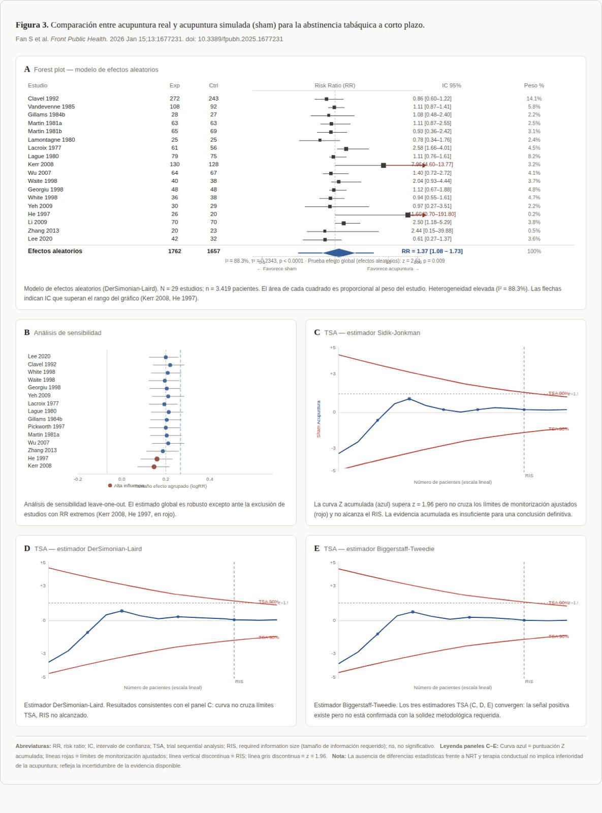 Aquí ocurrió algo importante: aunque la comparación acupuntura vs sham a corto plazo salió positiva, el TSA mostró que no se alcanzó el tamaño de información requerido y que la evidencia acumulada no cruzó los límites ajustados de confirmación. Eso no borra la señal favorable, pero sí obliga a interpretarla con prudencia: el beneficio a corto plazo parece plausible, aunque todavía no está consolidado con toda la solidez deseable.