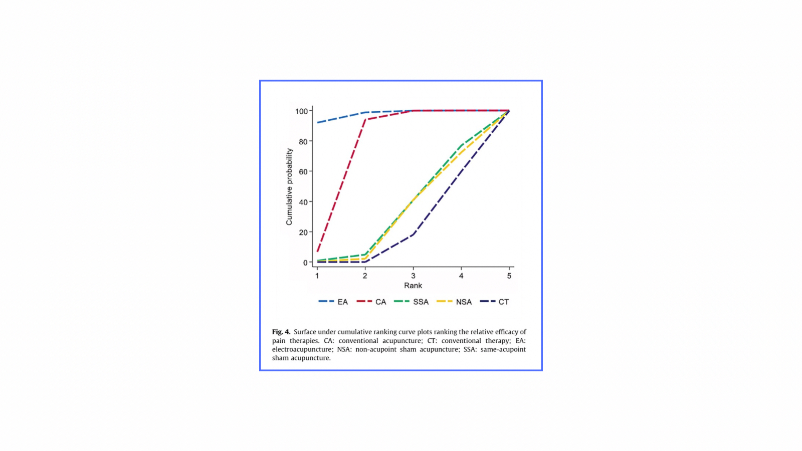 El ranking SUCRA para dolor (Figura 4 del artículo) ayuda a interpretar la jerarquía de eficacia: EA alcanza un 97,7%, AC un 75,1%, y, a notable distancia, NSA 29,1%, SSA 28,6% y la terapia convencional 19,5%. En términos prácticos, cuanto más cercano a 100% es el SUCRA, mayor es la probabilidad de que esa intervención se ubique entre las mejores de la red. Visualmente, la figura representa para cada tratamiento una curva acumulada de posiciones posibles; el área bajo esa curva (SUCRA) sintetiza toda la distribución de rankings. Así, un 97,7% para EA indica que, al integrar la totalidad de comparaciones directas e indirectas y su incertidumbre, EA tiene una probabilidad muy alta de situarse sistemáticamente en los primeros puestos para reducción del dolor. Del mismo modo, el 75,1% de AC tiene un rendimiento elevado aunque menos consistente que EA, mientras que valores por debajo del 30% (NSA, SSA y terapia convencional) sugieren que rara vez figuran entre las mejores opciones de la red.
