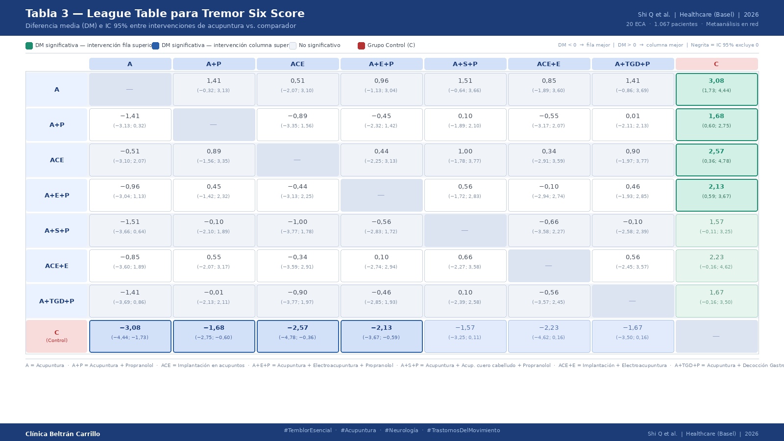 En términos de eficacia global, la tasa de respuesta fue analizada en los 20 estudios. El resultado agrupado mostró que las intervenciones relacionadas con acupuntura obtuvieron una tasa de respuesta aproximadamente cuatro veces superior a la de los controles, con un RR de 4.36 (IC 95%: 3.14 a 6.03; p < 0.00001). Además, no se detectó heterogeneidad estadística relevante en este desenlace (I² = 0%), lo que refuerza la consistencia interna del hallazgo. Cuando los autores desglosaron los resultados por modalidades concretas, identificaron nueve estrategias eficaces. Entre las más destacadas estuvieron la acupuntura del cuero cabelludo, con una OR de 12.67 (IC 95%: 1.40 a 114.42), la combinación de acupuntura + masaje + decocción Siping Dingchan + propranolol, con una OR de 6.75 (IC 95%: 1.82 a 25.03), y la combinación de implantación de catgut en puntos de acupuntura + electroacupuntura, con una OR de 5.33 (IC 95%: 1.01 a 28.21). En el ranking probabilístico, todas las intervenciones relacionadas con acupuntura quedaron por delante del control, y la acupuntura del cuero cabelludo ocupó la primera posición, con un valor SUCRA del 81.5%. El grupo control quedó en el último lugar. No menos importante es el análisis de la gravedad del temblor, medido mediante la escala Tremor Six Score. En 16 estudios con 814 pacientes en total, las terapias relacionadas con acupuntura también mostraron un beneficio significativo frente a control, con una diferencia media de -1.99 puntos (IC 95%: -2.25 a -1.73; p < 0.00001). Aquí sí apareció una heterogeneidad moderada (I² = 44%), aunque el efecto global se mantuvo claramente favorable. En el análisis por tratamientos, cuatro modalidades mostraron mejoría significativa frente al control en esta escala: acupuntura sola, con una diferencia media de -3.08 puntos (IC 95%: -4.44 a -1.73); acupuntura + propranolol, con -1.68 (IC 95%: -2.75 a -0.60); implantación de catgut, con -2.57 (IC 95%: -4.78 a -0.36); y acupuntura + electroacupuntura + propranolol, con -2.13 (IC 95%: -3.67 a -0.59). En el ranking SUCRA para esta variable, la acupuntura manual ocupó la mejor posición, con un 76.6%. La seguridad fue otro punto fuerte del trabajo. Frente al control, las intervenciones relacionadas con acupuntura se asociaron a una reducción significativa del riesgo de efectos adversos, con un RR de 0.13 (IC 95%: 0.07 a 0.25; p < 0.00001), sin heterogeneidad detectable. Además, la combinación de acupuntura + acupuntura del cuero cabelludo + propranolol fue la opción con mayor probabilidad de ser la más segura, con un SUCRA del 73.1%. Este hallazgo es clínicamente relevante, porque en el temblor esencial uno de los problemas reales de la práctica diaria no es solo la eficacia de la medicación, sino su tolerabilidad y la persistencia a largo plazo. Desde luego, el artículo no está exento de limitaciones. Los estudios incluidos fueron relativamente pequeños, la duración del seguimiento fue corta, y muchas intervenciones combinaban acupuntura con otras terapias de la medicina china, lo que complica aislar el efecto específico de cada componente. Aun así, el riesgo de sesgo global no parece desastroso, y desde luego no transmite la imagen de un campo completamente inservible o caótico. Más bien sugiere una literatura mejorable, pero con una señal terapéutica consistente. En conjunto, esta revisión ofrece un mensaje interesante: la acupuntura no solo se comparó con grupos de escasa exigencia metodológica, sino con el tratamiento convencional, fundamentalmente propranolol, y aun así mostró resultados favorables en respuesta clínica, reducción de la gravedad del temblor y seguridad. Eso no significa que deba sustituir automáticamente a los tratamientos de primera línea, pero sí apoya seriamente su papel como estrategia complementaria, y quizá en algunos pacientes como alternativa razonable cuando la respuesta farmacológica es insuficiente o la tolerancia es mala. En un trastorno frecuente, limitante y especialmente relevante en personas mayores, disponer de opciones adicionales con esta señal de eficacia y seguridad merece atención. Como tantas veces ocurre en medicina, no estamos ante una respuesta definitiva, pero sí ante una evidencia que invita a tomarse la acupuntura en serio. Referencia: Shi Q, Han J, Chen B, Gao S, Shen M. Comparative Efficacy of Acupuncture Therapy in Primary Essential Tremor: A Network Meta-Analysis and Systematic Review. Healthcare (Basel). 2026 Mar 21;14(6):803. doi: 10.3390/healthcare14060803. PMID: 41897256; PMCID: PMC13026131.