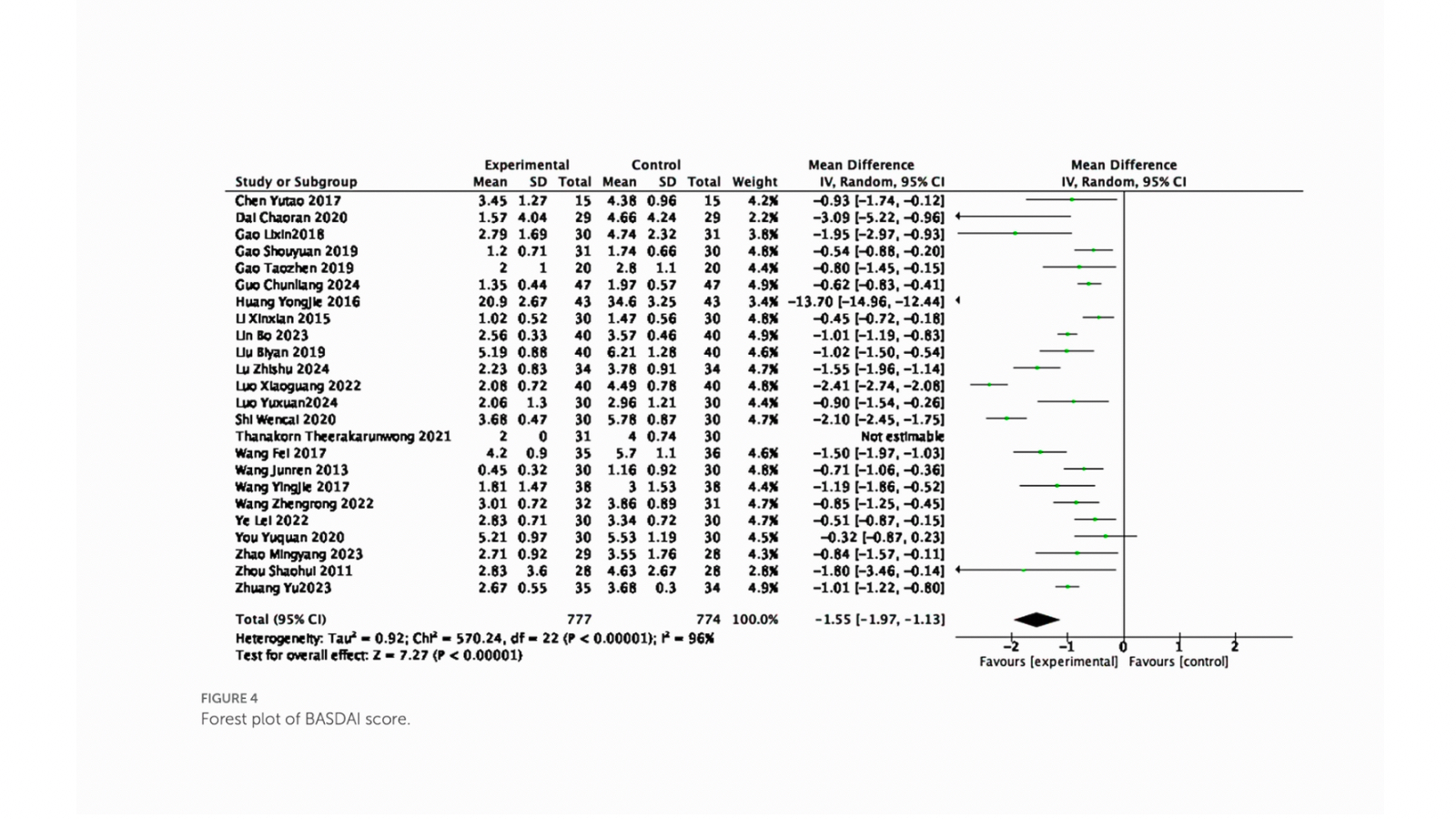– BASDAI (24 estudios; 1.551 participantes): MD -1.55 (IC95% -1.97 a -1.13; p < 0.0001), con heterogeneidad alta (I² 96%). Importante: pese a esa heterogeneidad, todos los estudios apuntaron en la misma dirección, a favor de la acupuntura. - BASFI (25 estudios; 1.717 participantes): MD -1.47 (IC95% -1.76 a -1.19; p < 0.0001), también con heterogeneidad muy alta (I² 96%). - ASDAS (2 estudios; 130 participantes): MD -0.57 (IC95% -0.82 a -0.33; p < 0.0001), heterogeneidad moderada-alta (I² 74%). Como resultados secundarios, igual de prácticos en la consulta, se observaron mejoras en dolor e inflamación sistémica: - Dolor (VAS) (16 estudios; 1.152 participantes): MD1.30** (IC95% -1.54 a -1.06; p < 0.0001), con heterogeneidad alta (I² 87%). - CRP (27 estudios; 1.882 participantes): MD -7.12 mg/L (IC95% -8.68 a -5.56; p < 0.0001), heterogeneidad muy alta (I² 98%). - ESR/VSG (25 estudios; 1.725 participantes): MD -7.22 mm/h (IC95% -9.13 a -5.32; p < 0.0001), heterogeneidad muy alta (I² 91%). Estas cifras describen un patrón coherente: mejora clínica (dolor, actividad y función) acompañada de descenso en marcadores inflamatorios. Qué significa realmente “MD”, “IC95%” e “I²” (sin jerga) - MD (diferencia de medias): es el cambio promedio adicional en el grupo con acupuntura frente al control. Por ejemplo, MD -1.55 en BASDAI significa que, de media, la actividad de la enfermedad bajó 1,55 puntos más con acupuntura que con el comparador. - IC95%: marca el rango plausible del efecto real. Si el intervalo no cruza 0, el resultado es estadísticamente significativo. En estos desenlaces, los intervalos son consistentes y siempre favorables. - I² (heterogeneidad): indica cuánto varían los resultados entre estudios. Aquí es alta, y eso suele reflejar diferencias en modalidades de acupuntura, duración, frecuencia y herramientas de evaluación. Los autores identifican precisamente estos factores como principales contribuyentes. En otras palabras: la señal de beneficio es robusta, pero el tamaño exacto del efecto puede cambiar según protocolo, duración o tipo de intervención. Un punto técnico relevante es que el análisis “leave-one-out” (quitando un estudio cada vez) mantuvo estables tanto el efecto combinado como la heterogeneidad, lo que indica que ningún ensayo aislado “explica” por sí solo el resultado global. En seguridad, el trabajo informa que no se registraron eventos adversos graves relacionados con acupuntura en los 35 ensayos; cuando aparecieron reacciones, fueron leves y transitorias en pocos casos. Conclusión Este metaanálisis aporta evidencia cuantitativa amplia: 35 ensayos aleatorizados y 2.591 pacientes. Los resultados apoyan que la acupuntura, en sus distintas modalidades, se asocia con mejoras significativas en los indicadores más útiles para EA (BASDAI, BASFI y ASDAS), junto con reducción del dolor (VAS) y de inflamación sistémica (CRP y VSG). La principal limitación es la heterogeneidad elevada, atribuida a variaciones de técnica, duración y medidas de resultado, lo que refuerza la necesidad de ensayos grandes, multicéntricos y comparativos entre modalidades para afinar qué protocolos ofrecen el mayor beneficio. Aun así, el mensaje clínico global es positivo: la acupuntura emerge como una intervención eficaz y segura, especialmente como complemento del manejo convencional de la espondilitis anquilosante. Referencia: Zhang J, Sun S, Bai R, Yin H, Chen J, Kong W. Efficacy of acupuncture in the management of ankylosing spondylitis: a systematic review and meta-analysis with insights. Front Neurol. 2026 Jan 13;16:1716550. doi: 10.3389/fneur.2025.1716550. PMID: 41607836; PMCID: PMC12836302.