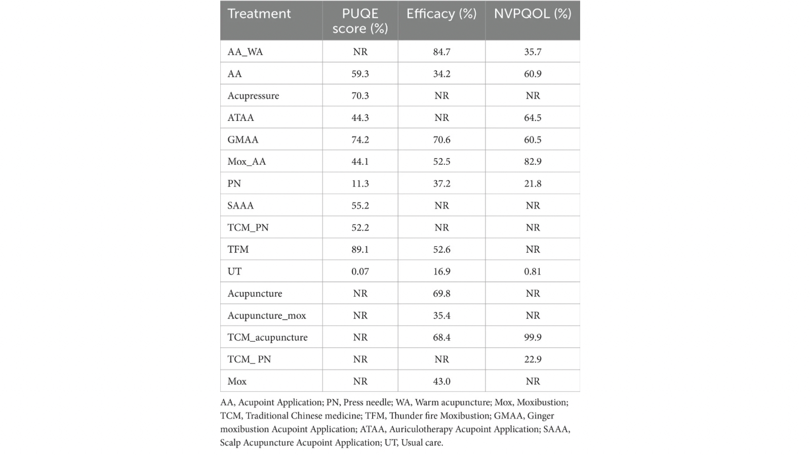 En síntomas (escala PUQE), el orden por área bajo la curva acumulada es contundente: Thunder Fire Moxibustion (89,1%) > GMAA (74,2%) > acupresión (70,3%) > UT (0,09%). En eficacia global (cese de náuseas y vómitos, desaparición de síntomas y sin recaídas al suspender el tratamiento), el ranking es AA_WA (84,7%) > acupuntura (69,8%) > acupuntura TCM (68,4%) > UT (16,9%). Y en calidad de vida (NVPQOL), el podio queda acupuntura TCM (99,9%) > Mox_AA (82,9%) > ATAA (64,5%) > UT (0,81%).