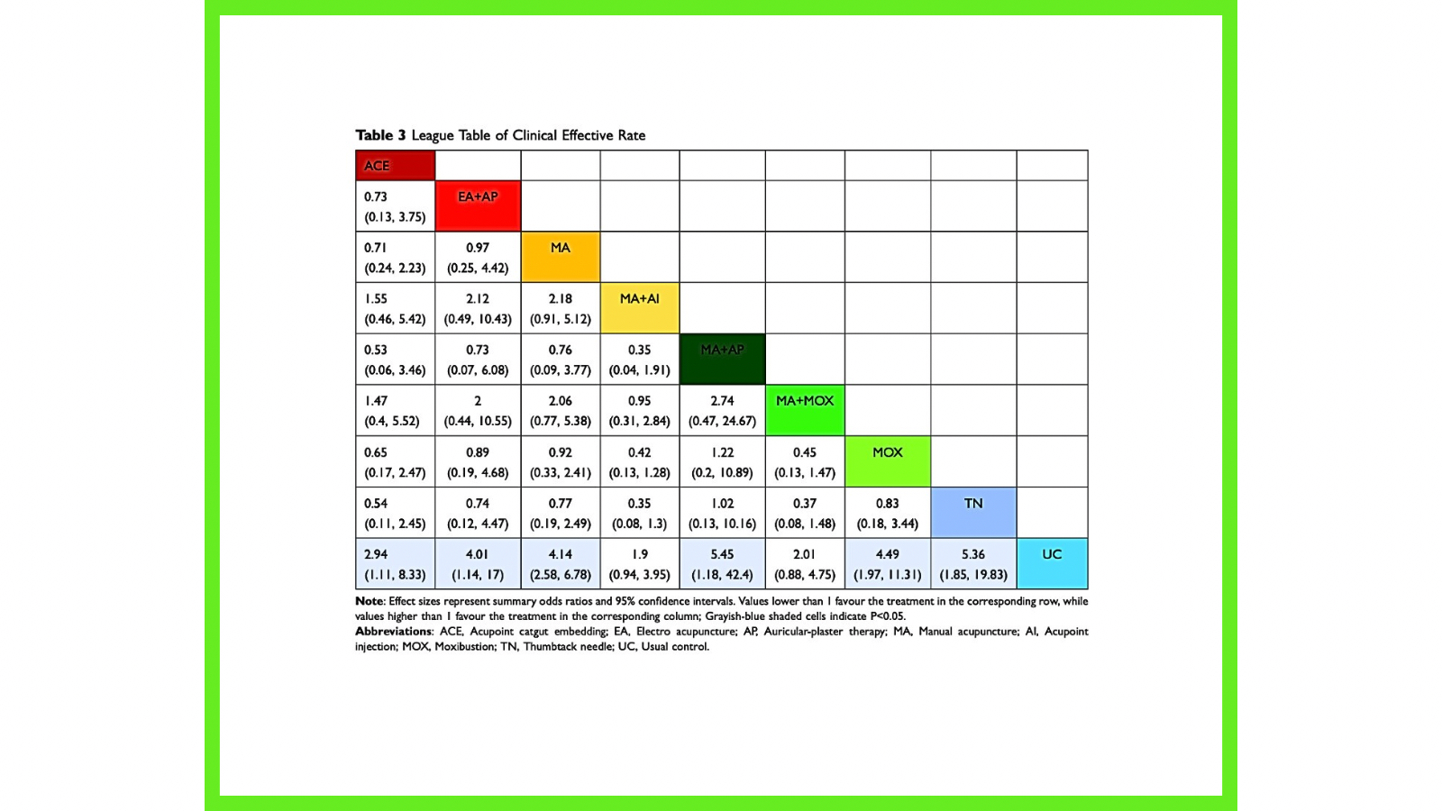 En el análisis de red, 20 estudios aportaron la tasa de efectividad clínica y construyeron un grafo con 9 nodos y 8 comparaciones directas, siendo MA la modalidad con más volumen de evidencia y con mayor frecuencia de comparación directa frente al control. En las comparaciones frente a control, varias modalidades se asociaron con mejores tasas de respuesta: ACE (OR=0.34; IC95% 0.12 a 0.90), EA+AP (OR=0.25; IC95% 0.06 a 0.87), MA (OR=0.24; IC95% 0.15 a 0.39), MA+AP (OR=0.18; IC95% 0.02 a 0.85) y MOX (OR=0.22; IC95% 0.09 a 0.51), con diferencias estadísticamente significativas. El ranking por SUCRA para este desenlace se ordenó, en descendente, como TN > MA+AP > MOX > MA > EA+AP > ACE > MA+MOX > MA+AI > control.