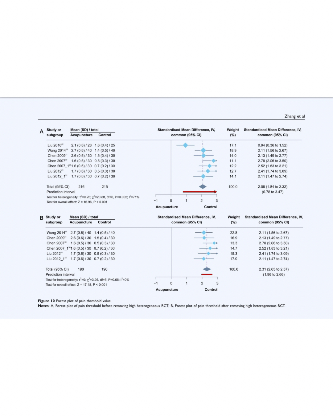 El artículo incluye un metaanálisis secundario a partir de 68 ECA únicos sobre acupuntura en pacientes con ciática. El análisis se centra en tres desenlaces clínicos principales: efectividad del tratamiento, intensidad del dolor y valor del umbral del dolor.