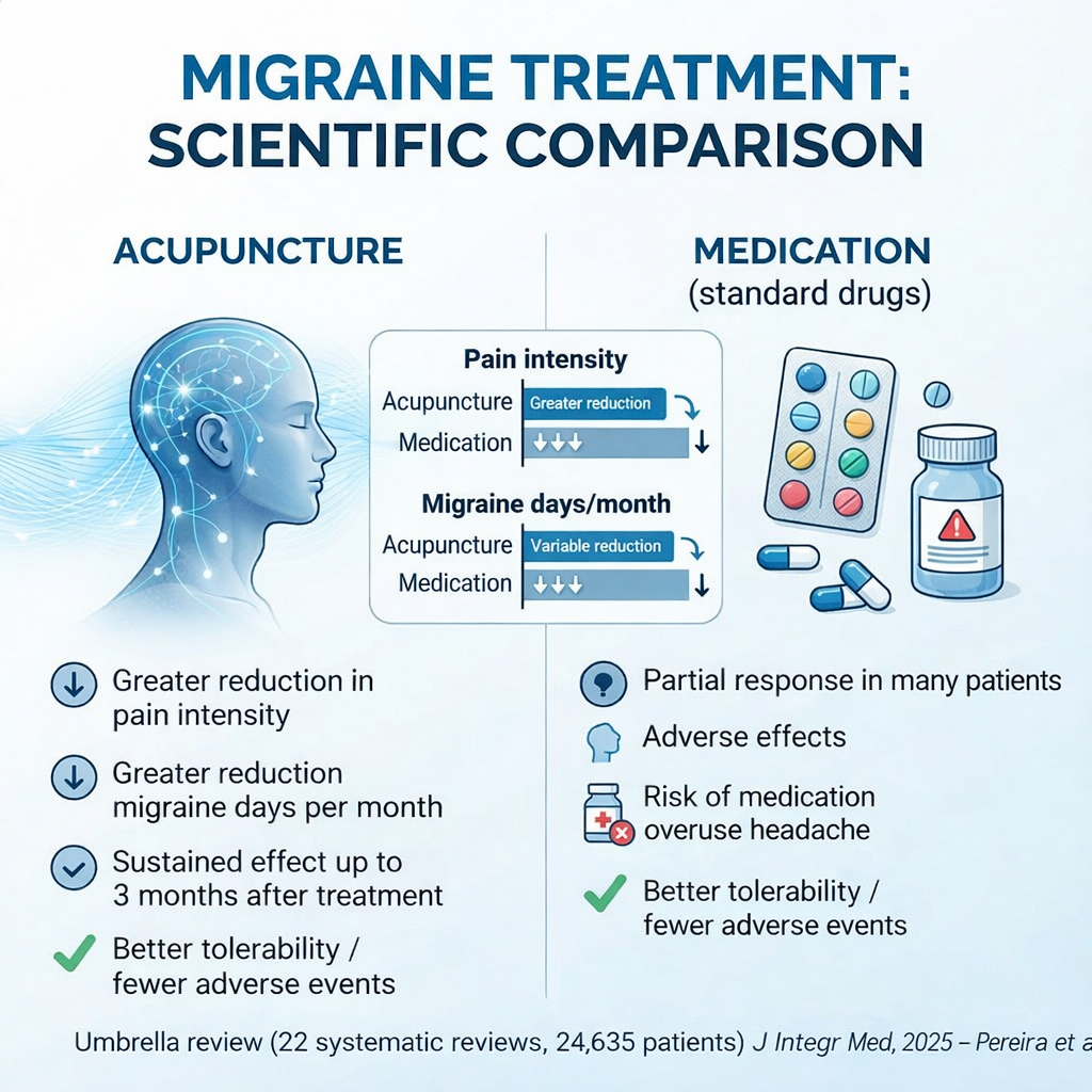 Los resultados numéricos son llamativos. En relación con la intensidad del dolor, la diferencia de medias estandarizada (SMD) fue de – 2,17, con un intervalo de confianza del 95 % entre – 3,25 y – 1,10, y una significación estadística clara (p < 0,001), a favor de la acupuntura. Para el número de días con migraña al mes, la SMD fue de - 2,92 (IC 95 %: - 4,65 a - 1,20; p < 0,001), de nuevo favoreciendo a la acupuntura. Estos valores indican un tamaño de efecto muy grande si se interpretan con los criterios habituales para diferencias estandarizadas, lo que sugiere un impacto clínico potencialmente relevante. No obstante, los autores señalan una heterogeneidad alta entre los estudios, algo esperable dada la diversidad de protocolos de acupuntura (puntos, dosis, número de sesiones), tipos de medicación comparadora, características de los pacientes y formas de medir los desenlaces. A pesar de esta heterogeneidad, los análisis por subgrupos muestran que la reducción tanto en la intensidad del dolor como en los días de migraña se mantiene hasta tres meses después de finalizar el tratamiento, lo que apunta a un efecto preventivo sostenido, no limitado solo al periodo activo de intervención. Desde el punto de vista metodológico, la calidad de las revisiones sistemáticas incluidas se valora como baja a moderada, y el grado de solapamiento entre ellas se considera moderado. Esto significa que, aunque la dirección del efecto (a favor de la acupuntura) es consistente, la certeza absoluta no es máxima y es razonable interpretar los resultados con prudencia, situándolos en su contexto. La conclusión de los autores es clara: la acupuntura es una alternativa segura y eficaz a la medicación en el tratamiento de la migraña. Proponen que se tenga en cuenta especialmente como tratamiento preventivo en varias situaciones clínicas: - Cuando los tratamientos farmacológicos convencionales no resultan suficientemente efectivos. - Cuando existen contraindicaciones o mala tolerancia a la medicación. - Cuando el paciente prefiere opciones no farmacológicas. En conjunto, este trabajo representa un ejemplo sólido de síntesis terciaria de la evidencia: integra múltiples revisiones sistemáticas y metaanálisis, evalúa su calidad y ofrece una visión de conjunto que va más allá de los resultados de un único estudio. El mensaje principal que se desprende es que la acupuntura no solo puede considerarse un complemento, sino una verdadera alternativa terapéutica a la medicación estándar en la migraña, con una reducción significativa de la intensidad del dolor y de la frecuencia de crisis, y un perfil de seguridad favorable. Referencia: Pereira PA, Marto CM, Oliveiros B, Botelho MF. Acupuncture is an effective alternative to medication for migraine: An umbrella review. J Integr Med. 2025 Oct 13:S2095-4964(25)00162-1. doi: 10.1016/j.joim.2025.10.003. Epub ahead of print. PMID: 41350152.