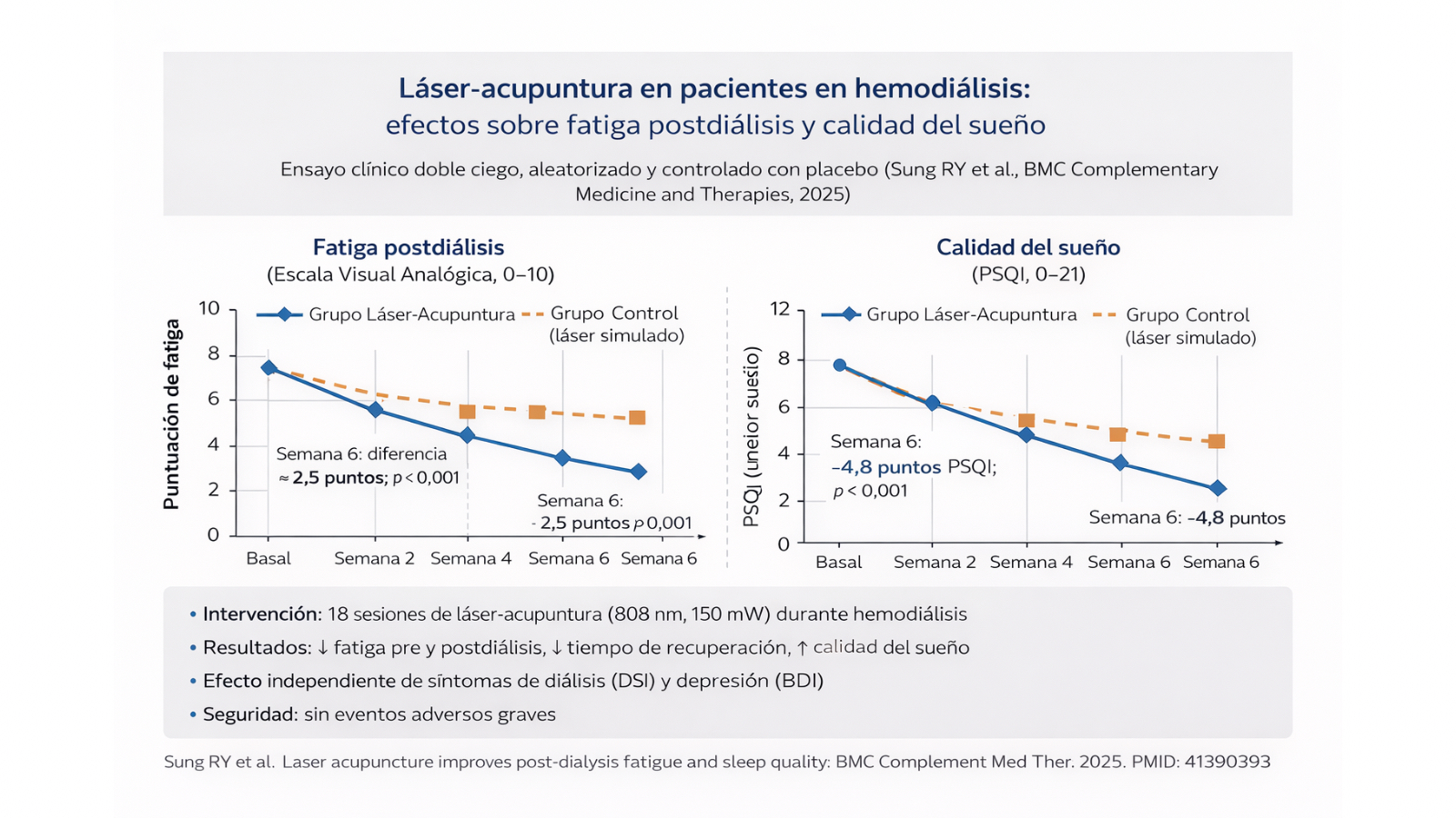 En este marco, se publicó un ensayo clínico doble ciego, aleatorizado y placebo-controlado realizado en un gran centro médico del norte de Taiwán, cuyo objetivo fue evaluar el efecto de la láser-acupuntura sobre la fatiga y la calidad del sueño en pacientes con enfermedad renal terminal en hemodiálisis (Sung RY et al. BMC Complement Med Ther. 2025). Se incluyeron adultos de 20 años o más, en hemodiálisis trisemanal desde al menos tres meses. Los participantes se asignaron al azar a un grupo de láser-acupuntura activa o a un grupo control que recibió el mismo procedimiento sin emisión de energía (“láser simulado”). Las evaluaciones se realizaron en basal y en las semanas 2, 4 y 6.