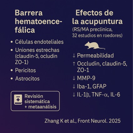 Efecto global: SMD = −0.65 (IC 95% −0.94 a −0.37; p<0.01). Traducción: en promedio, la acupuntura reduce la fuga del tinte hacia el cerebro; es decir, menos permeabilidad, mejor sellado de la BBB. Robustez: sin sesgo de publicación significativo (Egger p=0.053) y resultados estables al quitar estudios uno por uno. 2) Uniones estrechas (las “bisagras” del candado) Occludin: SMD = +1.73 (IC 0.14–3.32; p<0.01). Claudin-5: SMD = +4.44 (IC 2.26–6.62; p<0.01). ZO-1: SMD = +2.62 (IC 0.75–4.50; p<0.01); aquí se detectó sesgo de publicación, corregido con trim-and-fill, manteniéndose el efecto. Traducción: la acupuntura sube proteínas que sellan las uniones entre células endoteliales, reforzando la barrera. 3) MMP-9 (la “tijera” que daña la barrera) MMP-9: SMD = −3.29 (IC −5.18 a −1.40; p<0.001). Traducción: baja una enzima que rompe matriz y uniones: menos daño estructural a la BBB. Resultados robustos en sensibilidad. 4) Neuroinflamación glial (microglía y astrocitos) Iba-1 (microglía): SMD = −3.06 (IC −4.90 a −1.22; p<0.001). GFAP (astrocitos): SMD = −3.22 (IC −6.38 a −0.07; p<0.001). Traducción: menos activación glial, por tanto menos inflamación que afloja las uniones estrechas. Resultados consistentes en sensibilidad. 5) Citoquinas proinflamatorias (los “megáfonos” del daño) IL-1β: SMD = −3.35; TNF-α: −4.41; IL-6: −3.29 (todas p<0.001). Traducción: la acupuntura apaga señales inflamatorias que abren la barrera. 6) AQP4 (canal de agua implicado en edema) AQP4: SMD = −4.36 (IC −7.78 a −0.93; p<0.001). Traducción: menos AQP4 puede significar menos edema y menos estrés mecánico sobre la BBB; aquí la sensibilidad fue más inestable (el rango cambió bastante al quitar estudios). Tras esta síntesis cuantitativa, la interpretación global sugiere que la acupuntura refuerza la integridad de la BBB actuando en varios eslabones de la cadena: promueve la reparación de las uniones estrechas, reduce la presión “de corte” de las metaloproteinasas, amortigua la activación glial y silencia la señalización inflamatoria que perpetúa el daño; a la vez, al disminuir AQP4, podría limitar el flujo de agua responsable de distintos tipos de edema. Este patrón encaja con una acción coordinada a nivel de la unidad neurovascular, donde endotelio, glía y mediadores inmunes reequilibran la homeostasis cuando múltiples dianas se mueven en la misma dirección. No obstante, conviene ser prudentes. Toda la evidencia proviene de modelos animales y los parámetros de aplicación de acupuntura fueron heterogéneos, lo que dificulta identificar la “receta” óptima en términos de puntos, frecuencia, intensidad y duración. Además, varios dominios de calidad metodológica quedaron insuficientemente descritos, un rasgo habitual en investigación preclínica que puede inflar los tamaños de efecto. Por último, algunos resultados, en particular los relativos a AQP4, mostraron cierta sensibilidad a la exclusión de estudios individuales, lo que aconseja confirmación con series más homogéneas y protocolos estandarizados. En términos de práctica, la señal es muy alentadora: si la BBB es un objetivo terapéutico relevante en ictus y neurodegeneración, disponer de una intervención con evidencia capaz de modular simultáneamente permeabilidad, uniones, enzimas degradativas, inflamación y agua ofrece una hipótesis potente. Para llevarla del laboratorio a la clínica hacen falta ensayos en humanos que validen el beneficio funcional, definan parámetros de estimulación y utilicen biomarcadores de BBB (imagen, LCR o plasma) que permitan seguir el efecto de manera objetiva. Mientras tanto, esta RS/MA consolida la base biológica y habilita un marco razonado para diseñar esos estudios. Referencia: Zhang K, Liang Y, Wang Y, Yin T and Ming K (2025) Acupuncture improves blood–brain barrier integrity through multi-targeted mechanisms: a preclinical meta-analysis. Front. Neurol. 16:1648117. doi: 10.3389/fneur.2025.1648117