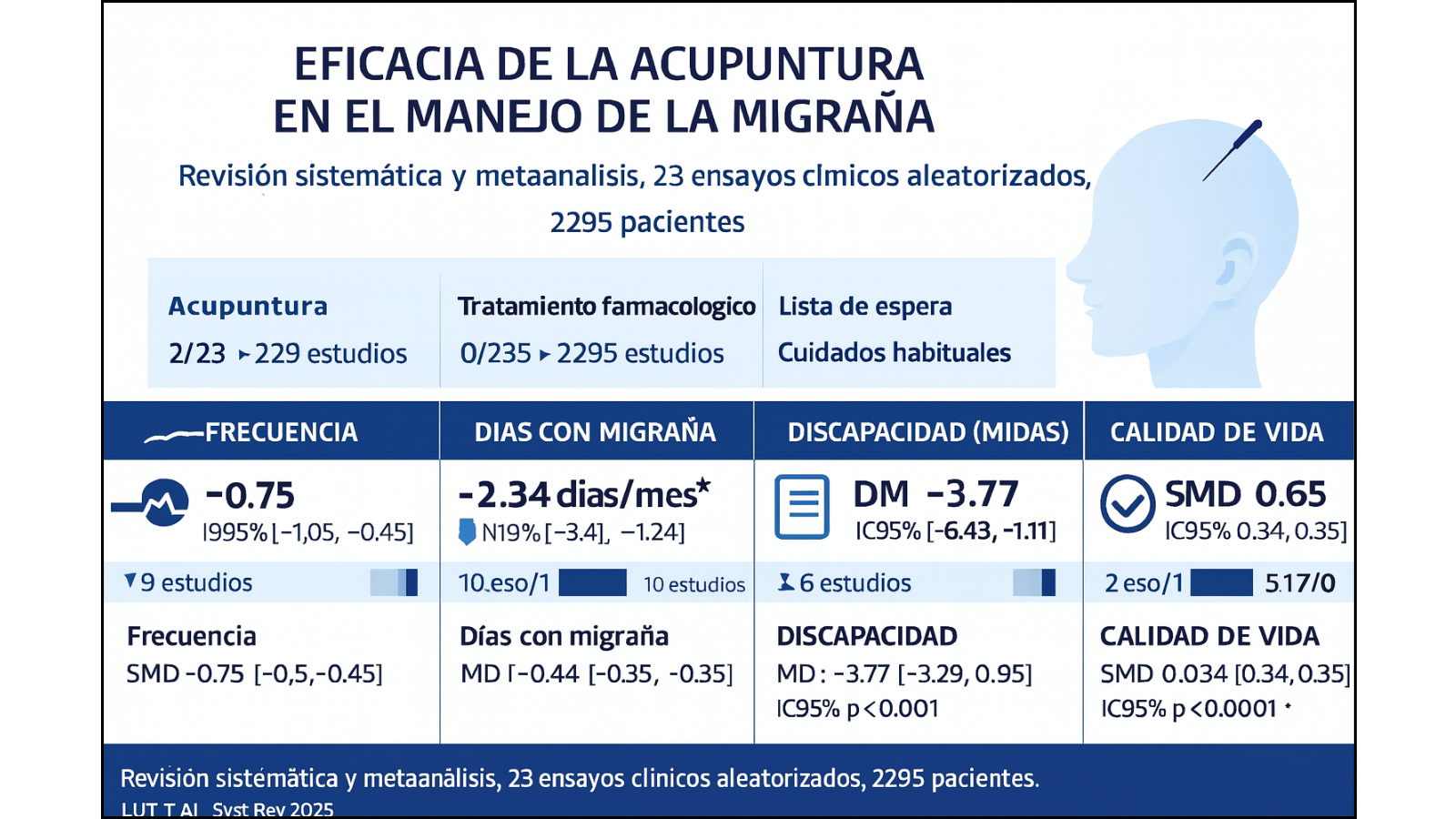 La revisión sistemática y metaanálisis de Lu T et al. (Syst Rev. 2025) que comentamos analiza precisamente el papel de la acupuntura en el manejo de la migraña. Incluye veintitrés ensayos clínicos aleatorizados con un total de 2295 pacientes diagnosticados de migraña, con o sin aura, según criterios de la International Headache Society o clasificaciones equivalentes. La intervención en todos los estudios fue acupuntura, y los grupos de comparación fueron variados: acupuntura simulada, tratamiento farmacológico (flunarizina, metoprolol, venlafaxina, entre otros), lista de espera, cuidados habituales o “usual care”. Los resultados analizados son muy clínicos y fáciles de traducir a la práctica diaria: duración de las crisis, número de ataques, días con migraña en un periodo de cuatro semanas, calidad de vida medida con cuestionarios específicos de migraña (MSQ, con sus dimensiones restrictiva y emocional) y discapacidad asociada mediante el cuestionario MIDAS.