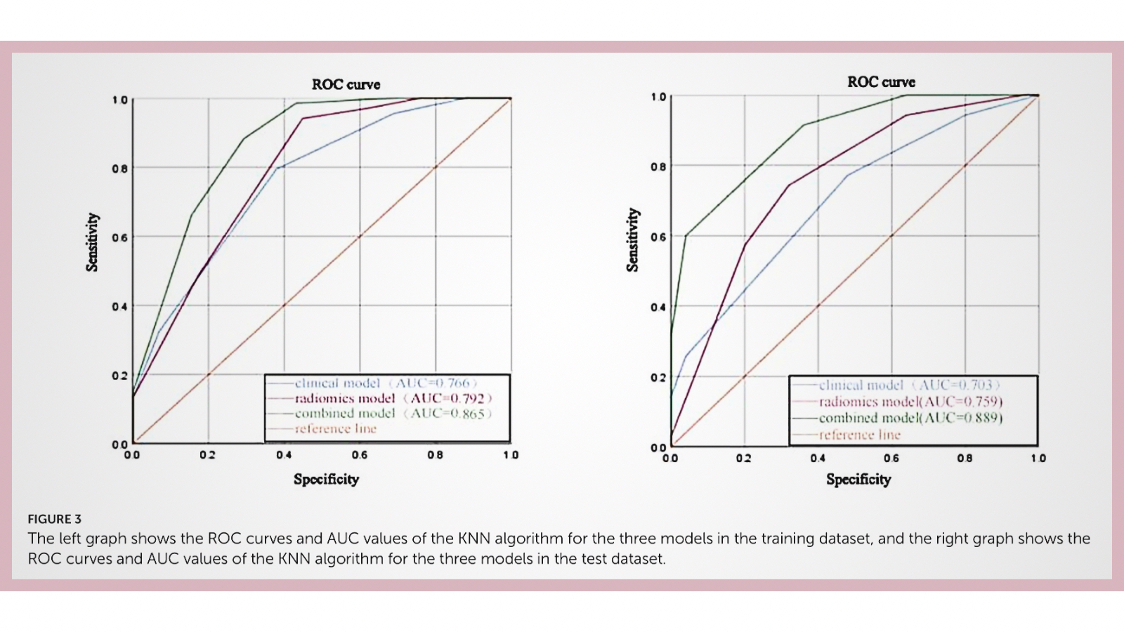 La tabla de resultados resume bien el mensaje principal. En el conjunto de prueba, el modelo clínico ofrece rendimiento limitado (AUC aproximadamente 0,689–0,703 según el algoritmo), el modelo radiómico mejora moderadamente (AUC 0,729–0,759), y el modelo combinado es el que alcanza mayor discriminación, especialmente con KNN. Con KNN, el modelo combinado obtuvo AUC 0,889 (IC95% 0,809–0,968), accuracy 0,800, sensibilidad 0,914 y especificidad 0,640, con precisión 0,781 y F1 0,842. En términos prácticos, el modelo identifica a la mayoría de respondedores (alta sensibilidad) pero comete un número relevante de falsos positivos (especificidad moderada), algo que los propios autores discuten en clave de riesgo de sobretratamiento y necesidad de optimización futura.