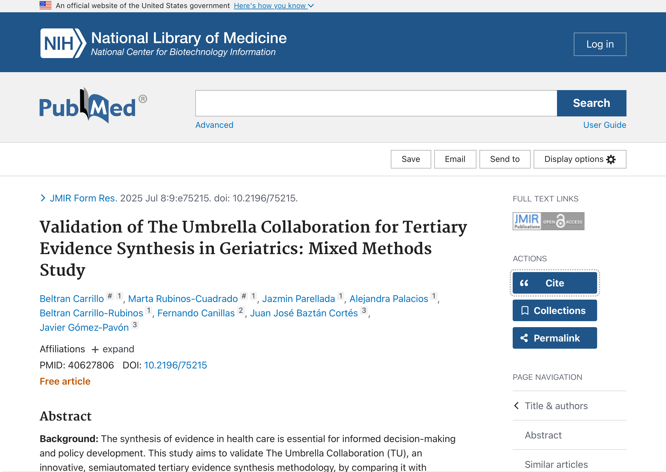 Carrillo B, Rubinos-Cuadrado M, Parellada J, Palacios A, Carrillo-Rubinos B, Canillas F, Baztán Cortés JJ, Gómez-Pavón J. Validation of The Umbrella Collaboration for Tertiary Evidence Synthesis in Geriatrics: Mixed Methods Study. JMIR Form Res. 2025 Jul 8;9:e75215. doi: 10.2196/75215. PMID: 40627806.